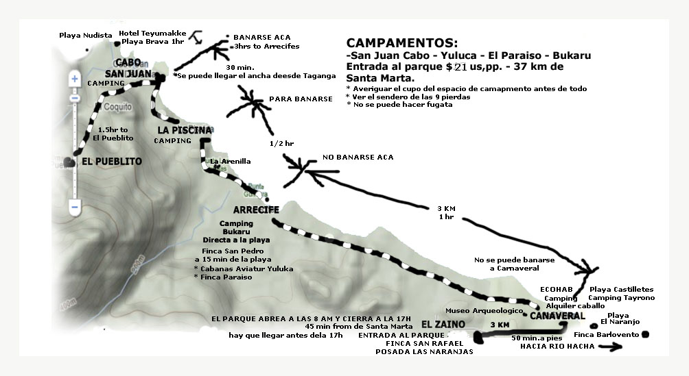 San Juan beach (20 min). Overnight on Arrecifes campsite. * Tayrona National Park is renowned for its unique combination of coral formations and jungle vegetation and we can enjoy hiking through forests, waterfalls, and lookouts with great views of the Sierra Nevada.